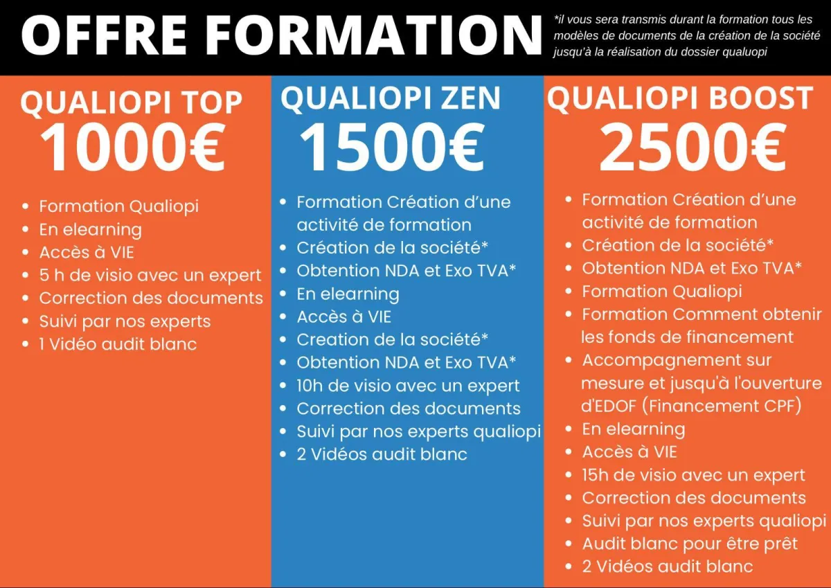 La durée du programme dépend de votre rythme et de vos disponibilités. Nous vous accompagnons à chaque étape, que ce soit pour obtenir votre numéro NDA, l'exonération de TVA, la certification Qualiopi ou l'ouverture de votre compte sur EDOF. Notre approche personnalisée vous permet d'avancer à votre propre vitesse tout en garantissant un accompagnement complet et adapté à vos besoins. Votre réussite est notre priorité.